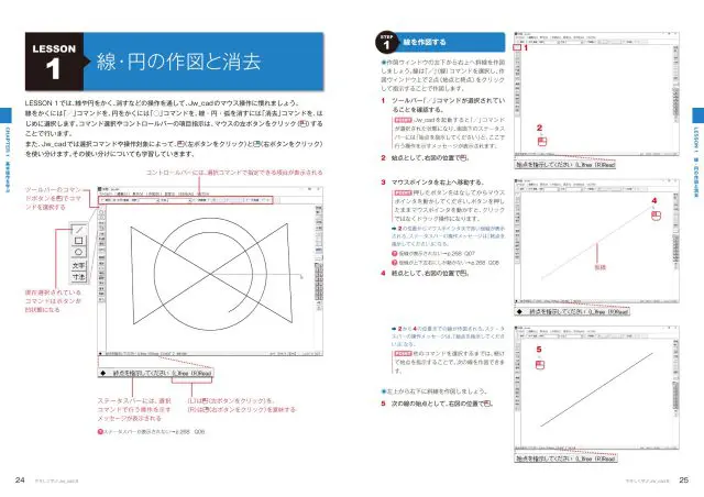 JW-CADの基本操作から応用まで、実際の画面をもとに機能説明、操作方法を解説しています。