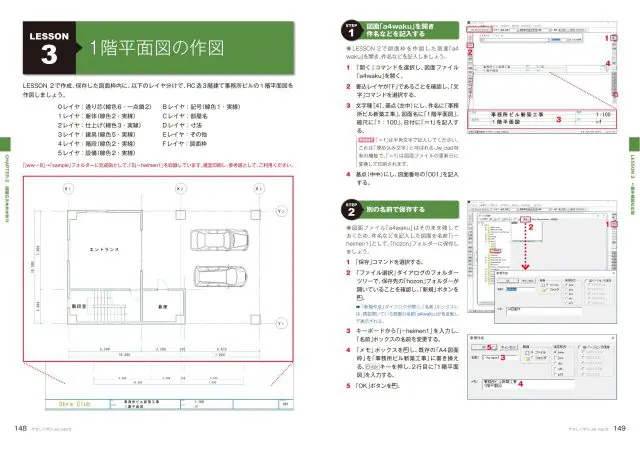 パソコンが苦手な方、初心者の方にもわかりやすいように、まずはJW-CADのダウンロードするところからわかりやすく解説しています。付録のCD-ROMにはJW-CADバージョン8がついているため、CD-ROMを読み込むだけですぐダウンロードし使い始めることが可能です。基本操作として、「図面の保存の仕方」「文字・寸法の記入」「基本図形の作図」等家具や部屋の平面図の書き方を学ぶことができます。また、平面図等の建物図面だけでなく敷地図の書き方等も収録しているため1冊で基本から応用まで学ぶことができる1冊です。