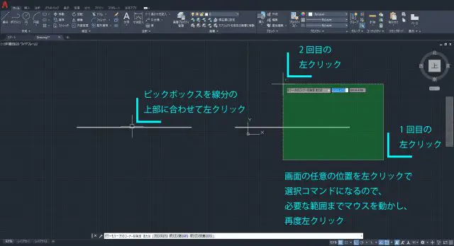 選択は、画面の任意の位置を左クリックし、マウスを左上へ動かし、また左クリックすることで実行できます。又は、線の上部にピックボックスを合わせて左クリックをすることでも選択可能です。