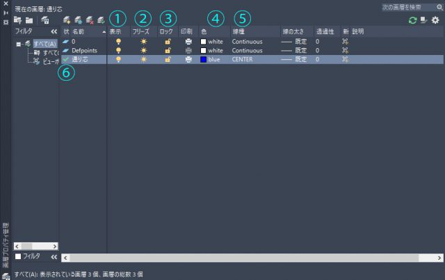 レイヤーの表示、非表示を設定します。「表示」との違いは、フリーズで指定した画層を非表示にした場合は、再作図(コマンド REGEN)も不可能となることです。この違いは、データの処理速度に影響するので、非表示にしたい画層は、基本的にはフリーズを使用すると、動きがスムーズになる場合が多いです。(PCのスペックによりますので、必ずそうする必要はありません。)