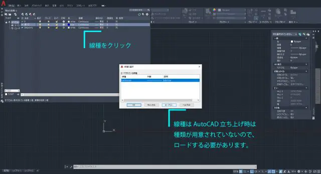 実践、点線、一点鎖線等を設定します。クリックして、ロードをクリックします。CENTERをクリックし、「OK」を選択します。前の画面に戻りますので、再度「OK」を選択し、線種の設定が完了です。