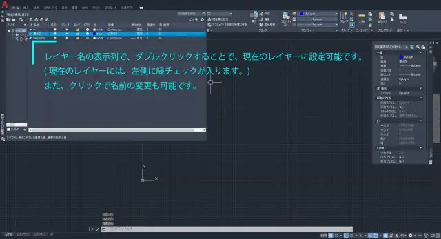 通り芯画層をダブルクリックし、現在の画層に設定しましょう。