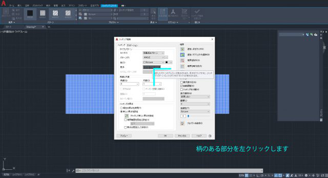 そうして柄を設定した上で[OK]で編集画面を閉じ、再度ハッチングする点やオブジェクトを選択することで、ハッチングを指定した柄で作成します。