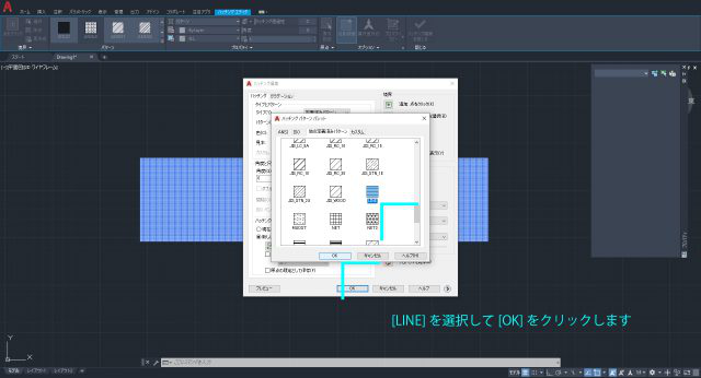 幾つかハッチング作成すればわかりますが、手順としては、ハッチングを一旦作成してから、ハッチング編集により目的のハッチング柄に変更しなくてはならないということです。