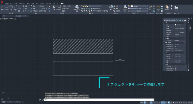ハッチングを作成しているオブジェクトを変更したい時や追加したい時の操作です。長方形をもう一つ作成しておきましょう。