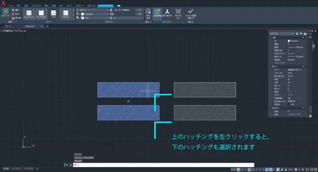 さて、この操作には、少しだけ重要なポイントがあります。それは、1つのハッチングデータで2つのオブジェクトをハッチングしているということです。