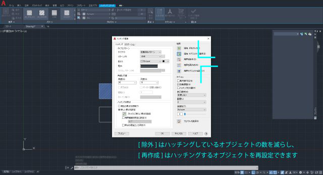 また、ハッチング編集画面で、[除外]や[再作成]を選択することで、ハッチングするオブジェクトの変更が可能です。
