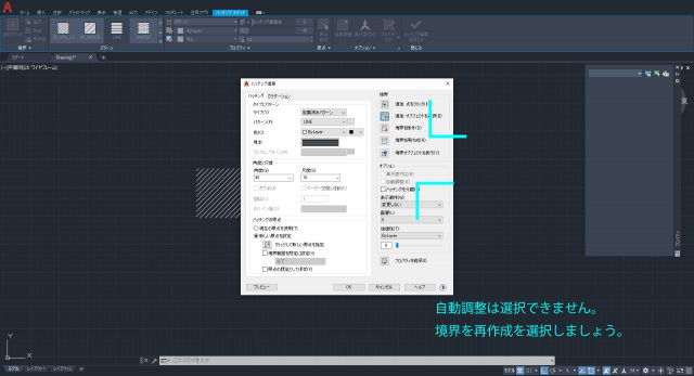 確認ができたら、ハッチング編集画面で、自動調整のチェックマークを左クリックにより解除します。[OK]で編集を完了させたら、先ほどと同じように、ハッチングをしているオブジェクトの端部を動かしてみましょう。