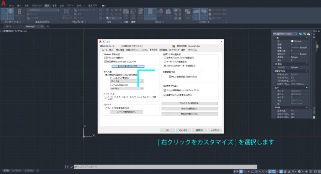 コマンドラインに「OPTIONS」を入力して[Enter]キーを押します。オプションメニューが表示され、AutoCADの様々な設定が可能です。基本設定タブの左上にある、[右クリックをカスタマイズ]を選択します。