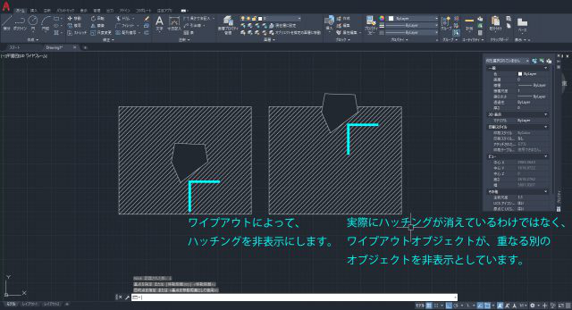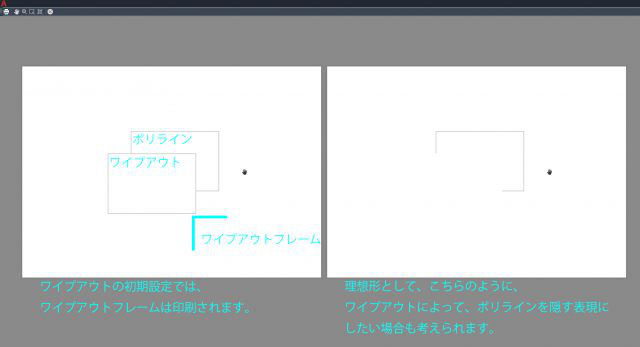 ポリラインを残すと、作成したポリラインと同じ形状のワイプアウトが、新たに作成されます。ワイプアウトが、ポリラインとの重なり部分を隠しているのがわかると思います。