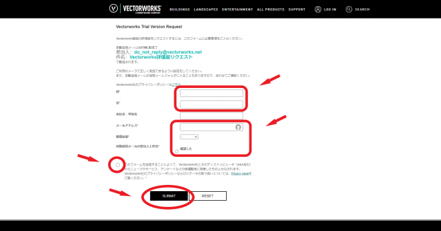 2. Vectorworks社のリンク先で、必要事項を記入し、「Submit」をクリック