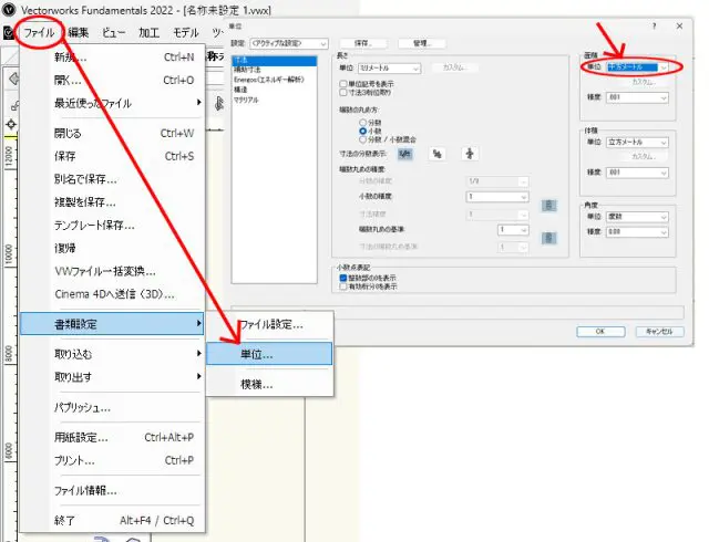 メニューバーから「ファイル」→「書類設定」→「単位」