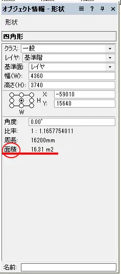 面積を求めたいオブジェクトを選択すると、データパレット中に面積が表示されています。