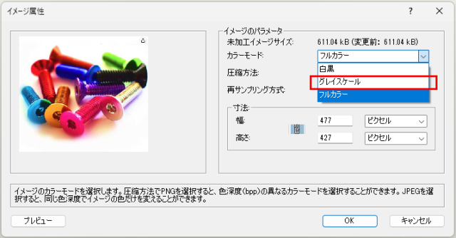 「カラーモード」のプルダウン部分の「グレイスケール」を選択すると、画像がモノクロに変わります。