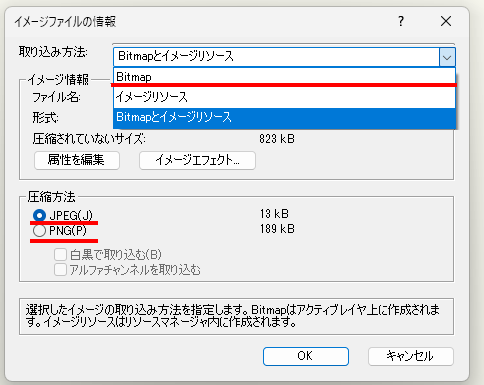 取り込む画像の保存形式は、「Jpg」「Tiff」「Bmp」「Png」「Gif」どれでも取り込み可能ですが、取り込みサイズを小さくするという意味では、「Gif」「Png」「Jpg」あたりが良さそうです。任意の画像を選択すると「イメージファイルの情報」ダイアログが出ます。取り込み方法は「Bitmap」、圧縮方法は「JPG」か「PNG」どちらかを選択します。