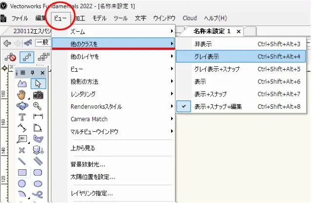 「+スナップ」とは、「表示」または、「グレイ表示」の図形にスナップする事ができます。「+編集」とは、「表示」のクラスとレイヤ内の図形を編集する事ができます。また、この方法で設定をした場合でも、オーガナイザ内で設定をしている場合は、そちらの設定が優先されます。クラス内を細かく設定する事できると、ある程度のルールに基づいた図面を書く時にとても効率的です。レイヤと同様に使いこなして、より良い環境で作図をしていきましょう。