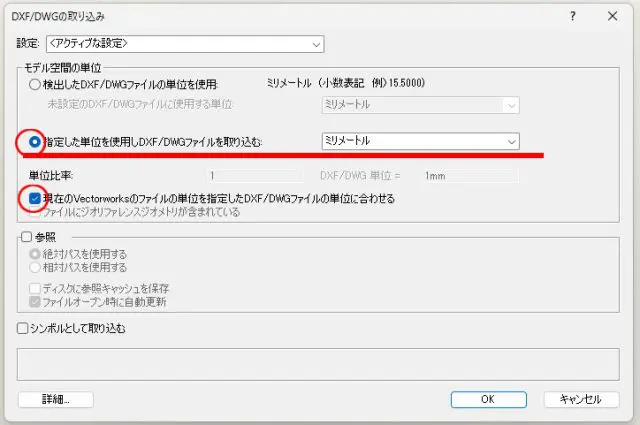 ファイル選択のダイアログが表示されますので任意のファイルを選択します。次のダイアログで必要個所の設定を行いますが、ここでは図面を変換する上で特に重要な所を確認します。「モデル空間の単位」この部分はデフォルトでは「検出したDXF/DWGファイルの単位を使用」になっていますが、このままだと元々の単位の設定が変わってしまう可能性がある為、「指定した単位を使用しDXF/DWGファイルを取り込む」にチェックを入れ「ミリメートル」で取り込みを行います。「単位比率」この部分は「現在のVectorworksのファイルの単位を指定したDXF/DWGファイルの単位に合わせる」にチェックを入れます。「OK」をクリックで取り込みが完了します。