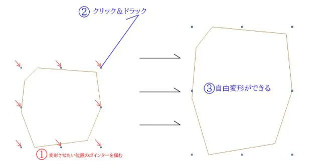 変形を行いたい図形を選択する、変形のポインターが6個出てきます。変形させたい位置のポインターを掴み移動させる事で自由変形を行う事ができます。縦横比を変えずに変形を行う場合は「Shift」を押しながらポインターを移動させる事で同比率の変形を行う事ができます。
