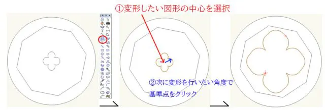 変形したい図面を選択、「リサイズツール」クリック、その後図形の中心をクリック、変形を行いたい角度で基準を設定するために任意の位置で変形基準の点をクリックします(縦横変形の場合は垂直な位置に基準を置く)。後は変形したい方向にドラックをすれば図形の中心を基準として、拡大縮小を行う事ができます。