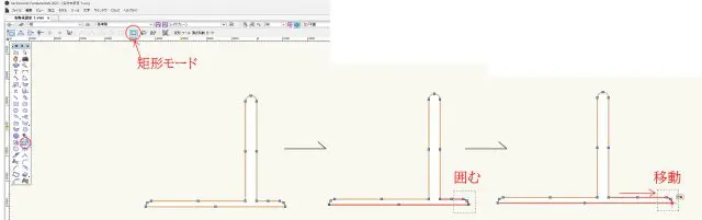 図形をダブルクリック、メニューバーの「矩形モード」を選択、形状を変えずに変形したい部分を囲みます。その後、囲んだ内側のポインターを掴み右に平行移動をすれば、延長をする事ができます。数値入力で延長する事も可能です。その場合は「矩形モード」で囲んだ後「図形移動」を選択し(ショートカット「Ctrl」+「M」)ダイアログボックスに数値を入力すると、現在の位置から入力数値分移動します。