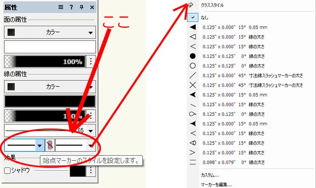 ▼の中にいろいろなマーカーのスタイルが入っています、この中から矢印を選択します。左側の枠から選択すると、線の始点に選択したマーカーが付きます、右側の枠からマーカーを選択すると線の終点の方にマーカーが付きます。真ん中の鎖マークにチェックを外しておくと、選択したマーカーが両端に付く形になります。
