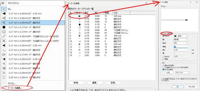 クラススタイルの下部の「マーカーを編集」をクリック、編集の元となるマーカーを選択しダブルクリックすると「マーカー編集」のダイアログが出ます、その中で面や底辺、角度や長さ等、編集が可能です。自分仕様のマーカーを作成してみましょう。