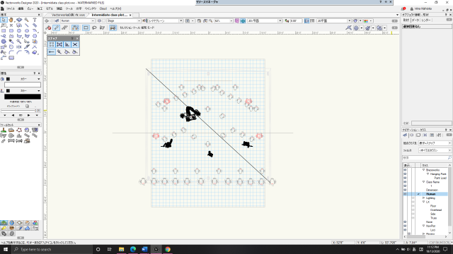 表示クラスはほぼ全てですが、吊り物や照明が灰色で表示されています。これらの図形は、他のデザインレイヤに存在するため、外面上では灰色での表示となっています。クラスは、別のレイヤー間で共有することもできます。ただし、ドラフト中には現在起動中のレイヤーに描かれている図形のみはっきりと表示され、他レイヤー内の同じクラスの図形などはグレーアウトされます。