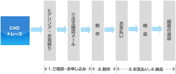 お申込み内容を確認し、お電話にて詳細なヒアリングをさせていただきます。ヒアリング内容を元にお見積り(仮)をメールにて提出いたします。おおよそな制作日数(※)も、お伝えいたします。お見積り金額にご納得いただけましたら、メール返信にてご発注の旨お伝え下さい。その後、ご注文・再注文フォームへ添付、または郵送にて図面(原図)を弊社へご提出下さい。図面が到着後、制作を開始いたします。