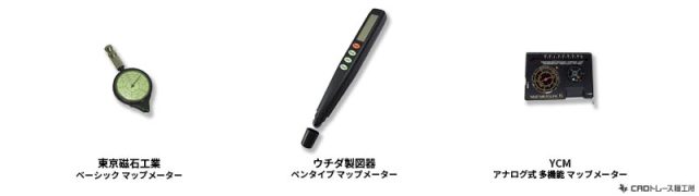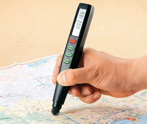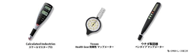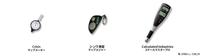 製図された紙面上から寸法記載されていない距離を測定することが可能なアイテムです。直線であれば三角スケールを使用したり、比率計算から、なんとなくその長さを測定することも可能ですが、曲線などの非直線となると困難です。そこでマップメーターを使用します。線を紙面上からマップメーターでなぞっていくだけで概ねの寸法が測定できるので非常に便利です。大きさは手のひらサイズが一般的で、紙面上をなぞるためのローラーと測った距離の表示機能が付属されています。デジタル式の場合だと、地図の縮尺を入力すると実距離を計算して表示してくれるようなハイスペックなものもあります。