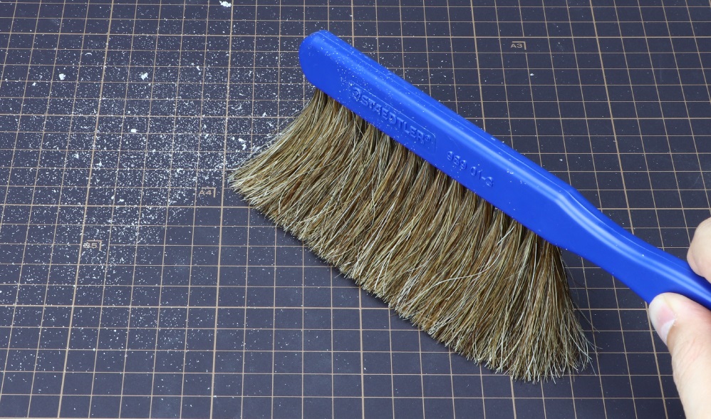 図面作成の際に発生する消しゴムの消しカスなどの不要物は、そのままにしておくと図面に汚れを残したり、きれいに線を引く妨げとなります。そこで、図面上及びその周辺に散見される汚れやごみを除去するために製図用ブラシを使用します。汚れやごみを手で除去しようとすると、手指の脂により、かえって汚してしまう事にもなりかねません。