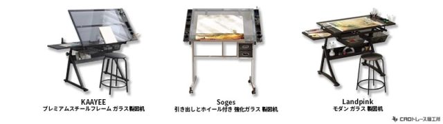 木製、ガラス製などがあります。木製とガラス製の違いは、ライトテーブルとして使用できるかどうかです。ガラス製は全体がガラス製というわけではなく、テーブル面が対象です。ガラスを使用することで、ライトテーブルとしてトレースの用途を可能としています。ガラス材はその名の通り材質がガラスなので取り扱いには十分注意した上で使用する必要があります。トレース機能までは不要ということであれば木製でも十分に機能は確保できますので、作業内容との兼ね合いで選定しましょう。