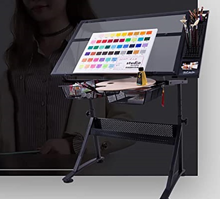 製図机のおすすめ人気ランキング第11位は『Soges 引き出し&キャスター製図机』です。ドラフトテーブルは強化ガラス製のテーブルトップと頑丈な金属フレームで作られています。また、ブレーキ付きキャスターにより、机を所定の位置に容易に移動することができます。