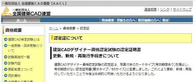 建築CADデザイナー資格認定試験は、2006年度を以って終了しました。ただし、有資格者は認定証の更新、再発行をすることができます。更新(有効期限切れ)、再発行には手数料が必要です。