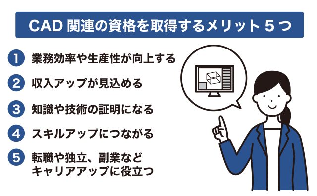資格を取得することでCADに関する知識や技術を体系的に学ぶことができるので、その結果として業務をこなす正確性やスピードが向上します。