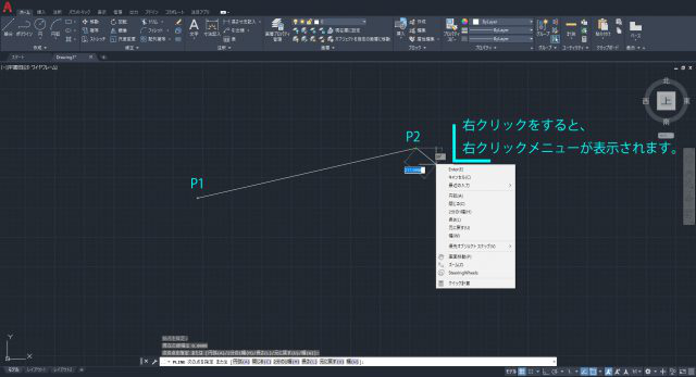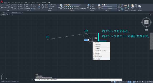 ③任意の2点目(P2)を左クリックにより指定します。3点目、4点目も左クリックにより連続して指定可能です。