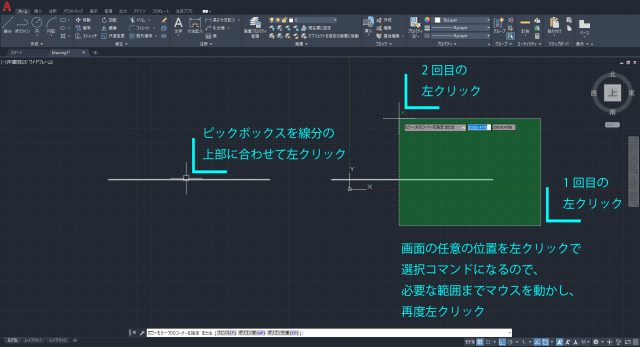 選択は、画面の任意の位置を左クリックし、マウスを左上へ動かし、また左クリックすることで実行できます。又は、線の上部にピックボックスを合わせて左クリックをすることでも選択可能です。