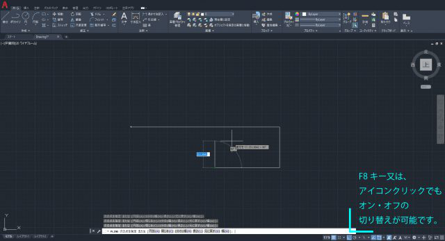 線を描くことは、任意の点をクリックすることで実行できますが、図面として作成する以上、ある寸法の線を描く必要がある場合も考えられます。長さ5,000mmの水平線を描いてみましょう。水平・垂直がオンとなっていることを確認してください。