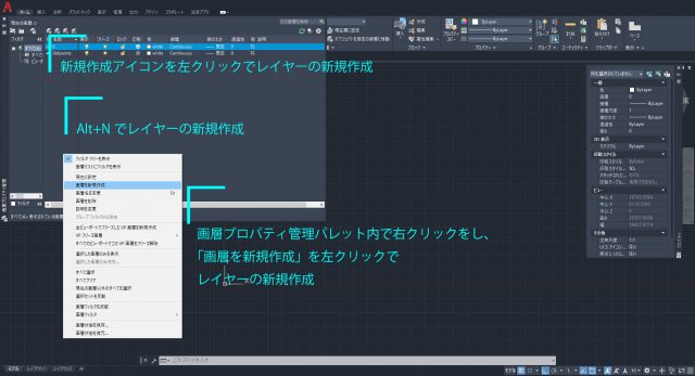 画層作成が出来れば、その編集をより効率的に行う為、プロパティパレットを表示させましょう。操作の詳細は、別記事 作図基本⑤ で紹介しています。