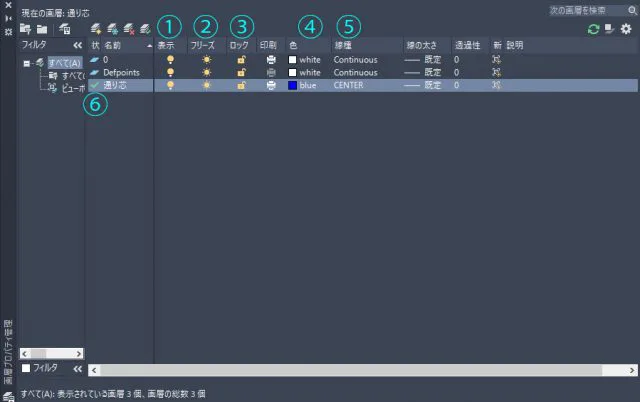 レイヤーの表示、非表示を設定します。「表示」との違いは、フリーズで指定した画層を非表示にした場合は、再作図(コマンド REGEN)も不可能となることです。この違いは、データの処理速度に影響するので、非表示にしたい画層は、基本的にはフリーズを使用すると、動きがスムーズになる場合が多いです。(PCのスペックによりますので、必ずそうする必要はありません。)