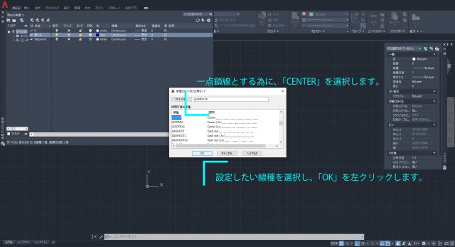 実践、点線、一点鎖線等を設定します。クリックして、ロードをクリックします。CENTERをクリックし、「OK」を選択します。前の画面に戻りますので、再度「OK」を選択し、線種の設定が完了です。
