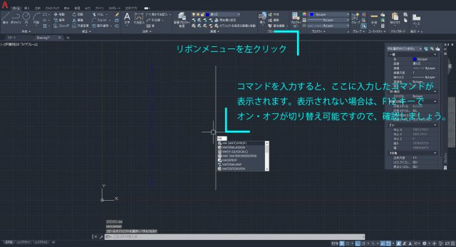 線を選択してみましょう。この画面には、線の情報が記載されているだけでなく、色や画層の変更も行えます。また、寸法や文字等の場合は、大きさ等も設定できるので、常に表示させましょう。