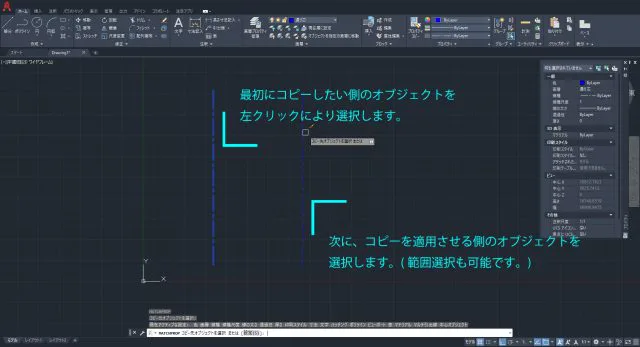② コピーしたい属性の線を左クリックにより選択します。(左クリックの選択のみが可能です。)