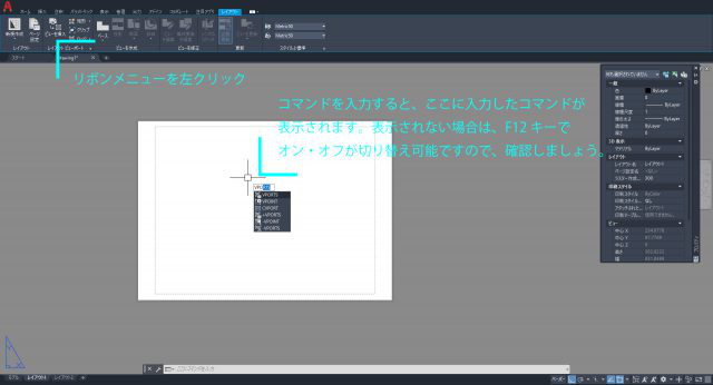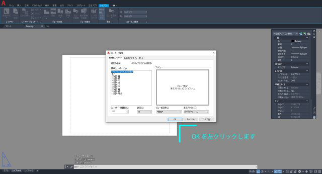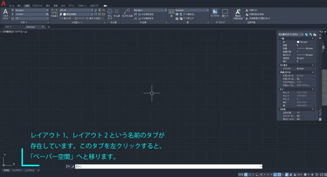[レイアウト1]を左クリックし、「ペーパー空間」を表示しましょう。後の作業で、プロパティパレットの表示が必要です。(別記事 「作図基本⑤ 文字を書く」を参照)