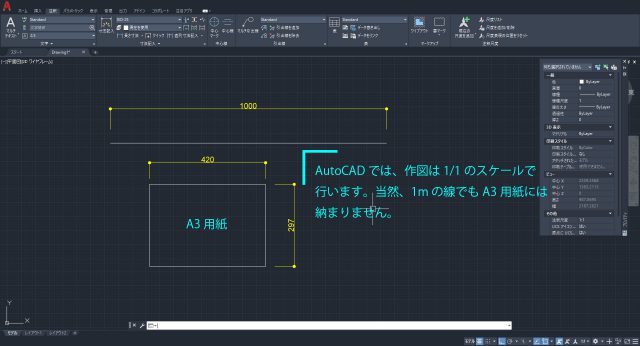 AutoCADは1/1のスケールで図面の作図を進めます。単位は初期設定で「mm」ですので、1mの線を引きたければ「1000」という数値を入力して線を描く必要があります。さて、実際に建築図面を出力する際は、用紙のサイズはA3かA1が基本です。A3用紙の長辺方向で420mmの幅ですから、1mの線を実寸で出力することはできません。その為に、図面を印刷する際に1/100等の尺度を決めて印刷することになります。