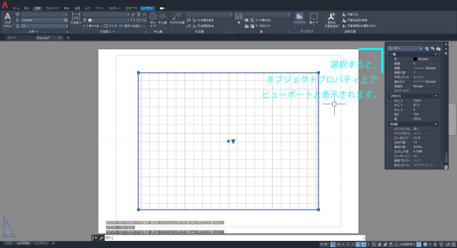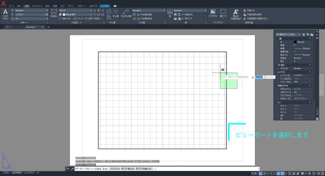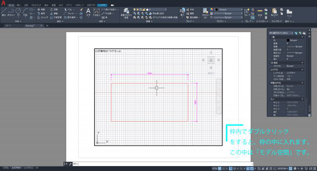「ビューポート」とは、簡単に伝えれば「モデル空間」を映し出せる枠です。「ビューポート」の枠内でダブルクリックします。すると、「ビューポート」の枠が太くなります。