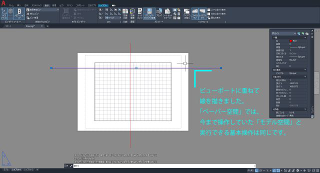 この操作で伝えたいのは、「ペーパー空間」は「モデル空間」と操作できることは基本的には変わらないということです。マウスホイールを上下すれば、拡大・縮小を行えますし、今までの記事で解説したコマンドは全て使用できます。