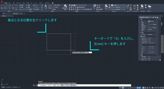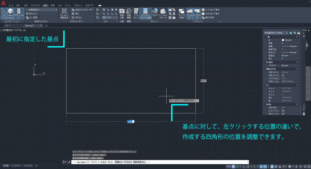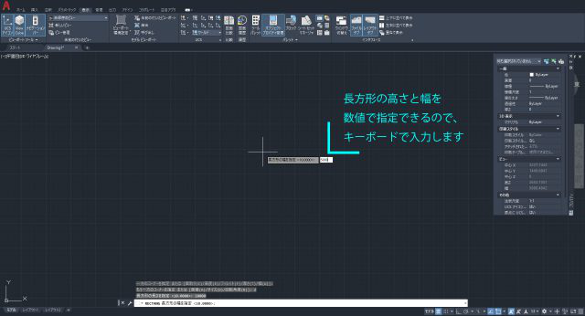 さて、「ペーパー空間」を少し触れたところで、「モデル空間」に一旦戻り、これからの解説の下準備をします。「モデル空間」にYL=5000mm、XL=10000mmの長方形を描いてみましょう。ここで、「レクタング」コマンドを軽く紹介します。