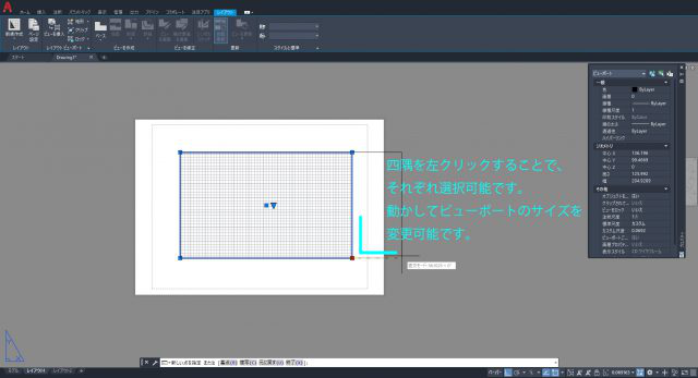 作成したビューポートを選択し、四隅にスナップ(選択)できますので、左クリックして動かしてみましょう。この操作により、ビューポートのサイズを変更可能です。