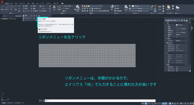① エイリアス[HE]でハッチング編集の別画面を開きます。