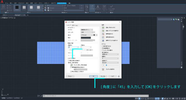 ④ 再度、ハッチング編集画面が表示されるので、[OK]を左クリックで、ハッチングが完了します。